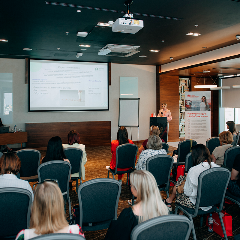Врач — онколог-дерматолог, маммолог клиники «СОВА» Соляная Евгения Викторовна провела лекцию на тему «Профилактика онкологии, возможно ли это?».