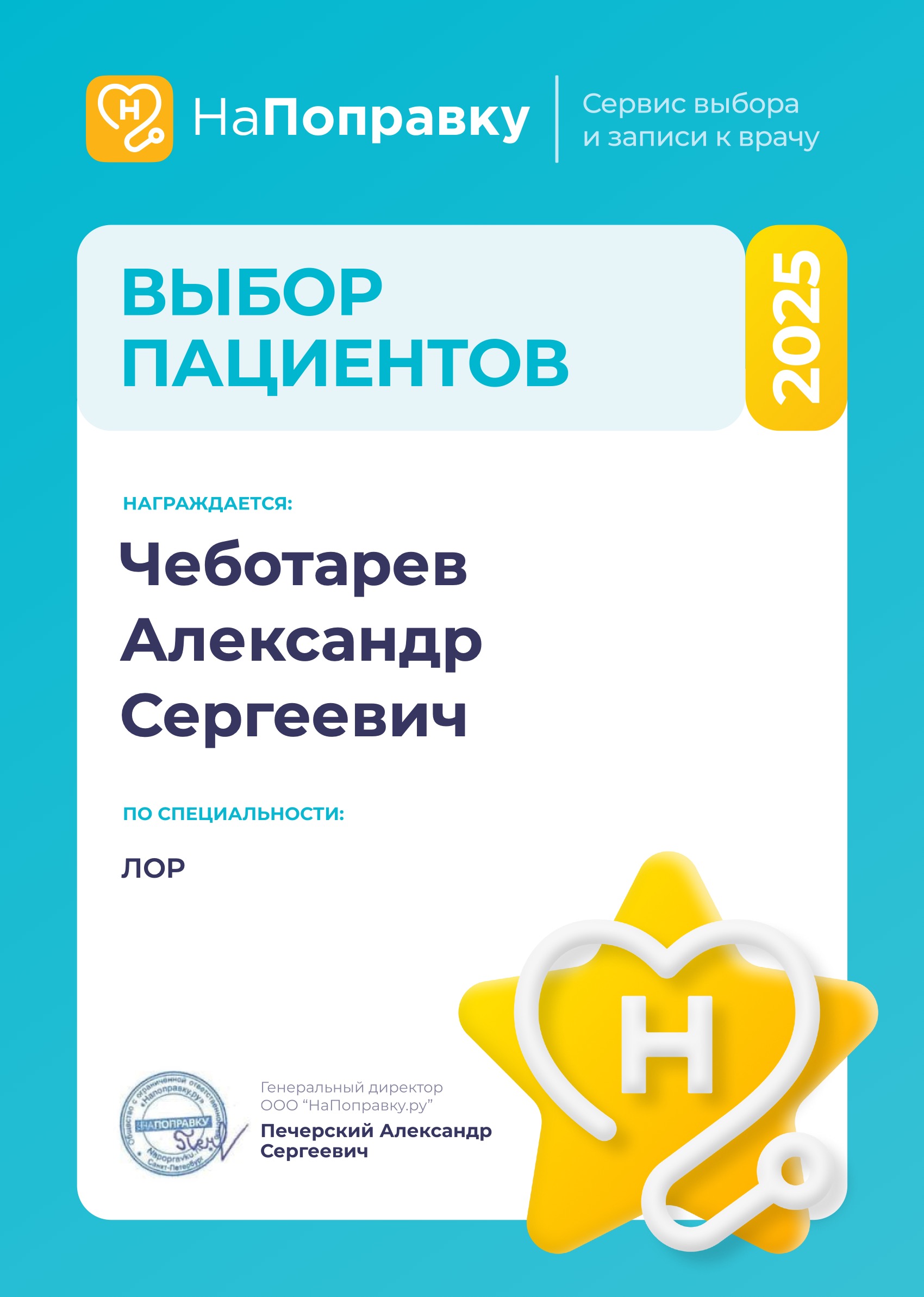Всероссийская премия ПроДокторов 2025: 3 место в категории "ЛОР" по Воронежской области.Прием пациентов с симптомами и заболеваниями: