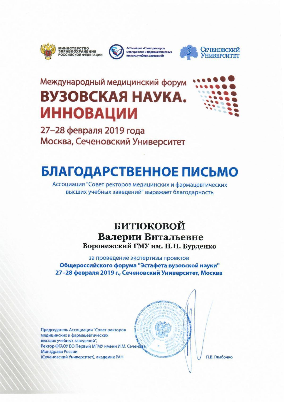 • "Акушерство и гинекология", ФГБОУ ВО «Воронежский государственный медицинский университет им. Н.Н.Бурденко» Минздрава России. Срок действия с 25.07.2023 г. по 25.07.2028 г.