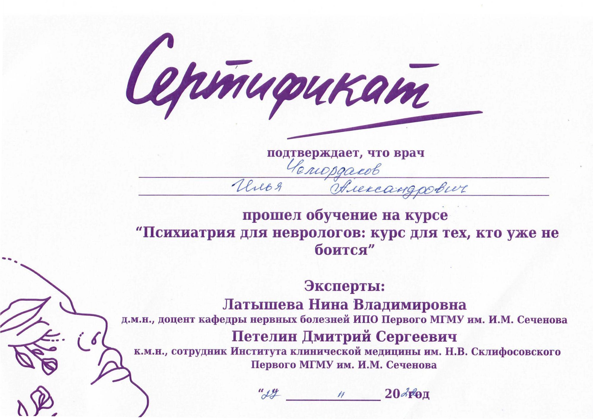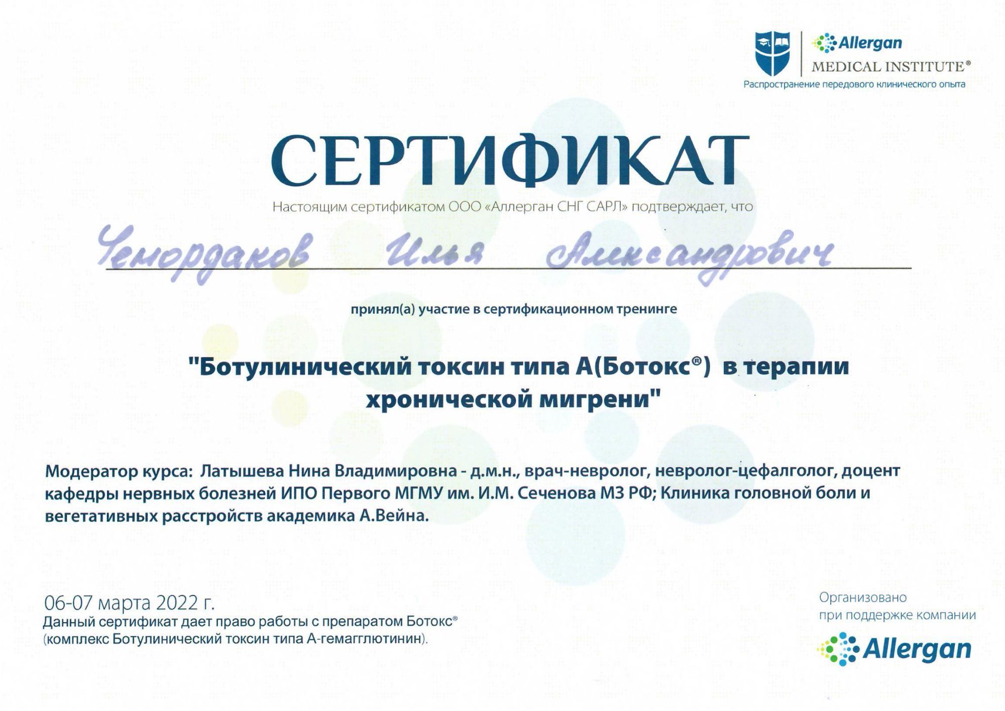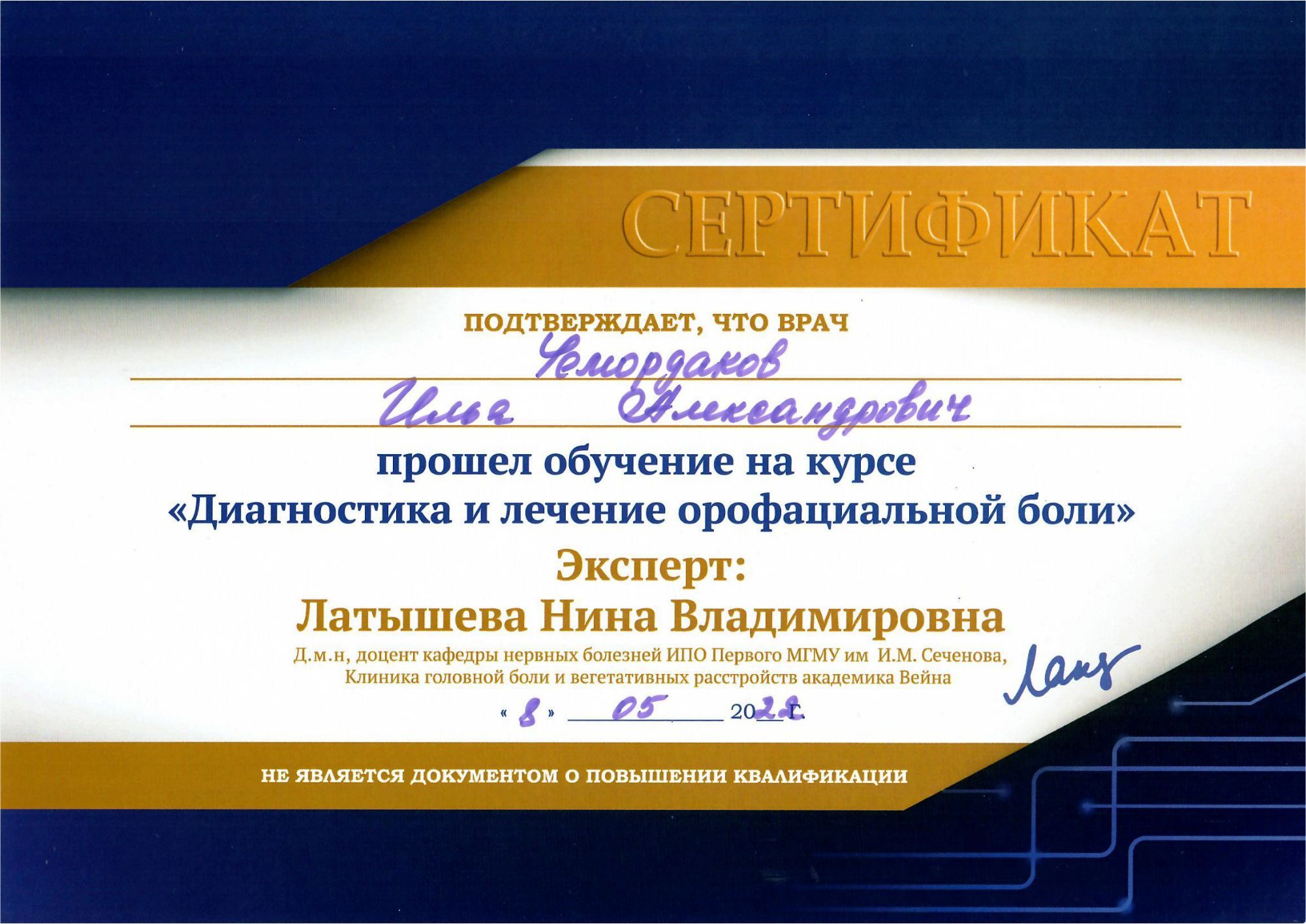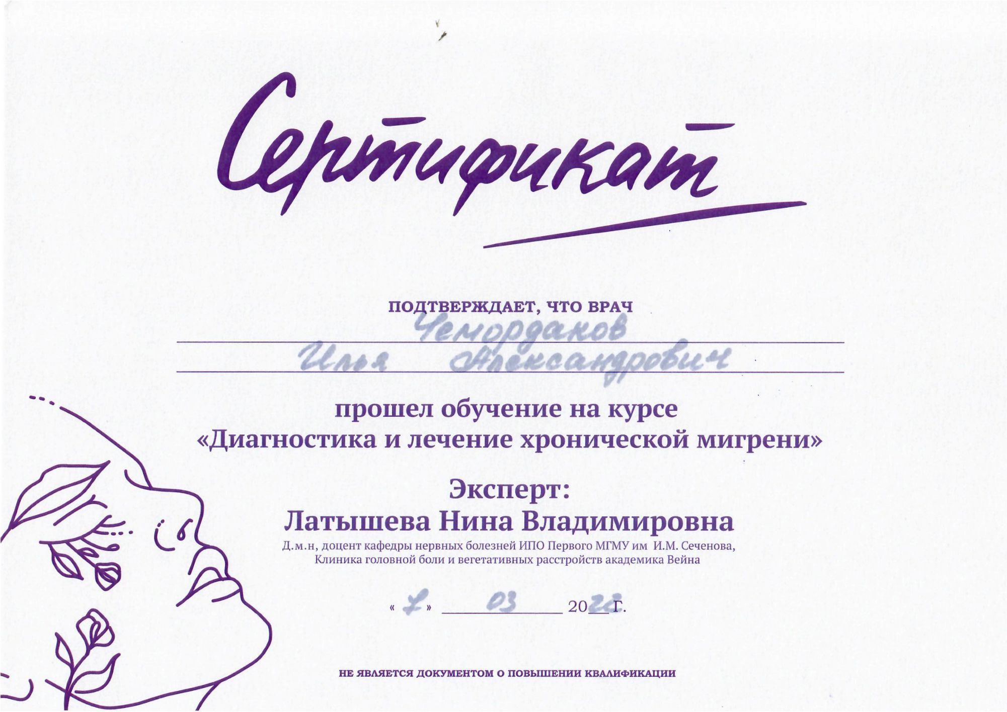 Не первый раз обращаюсь в клинику Сова, к доктору Чемордакову И А, страдаю мигренью более 30 лет, грамотный, открытый к общению специалист, обговариваем разные методы купирования головной боли, рассказывает, объясняет, самое главное понимающий и сочувствующий доктор. Спасибо вам Илья Александрович за ваш труд, терпения и здоровья вам!
