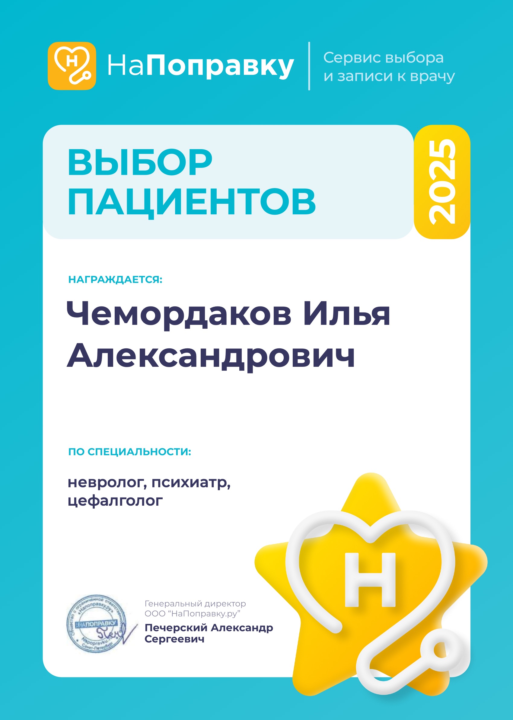 Хочу выразить огромную благодарность Илье Александровичу! Я обошла кучу врачей и все говорили разное и не могли определить причину моего состояния. По счастливой случайности я попала на прием к Илье Александровичу. Он очень долго со мной разговаривал и в итоге поставил правильный диагноз и назначил правильное лечение. В отличие от других врачей, которые мне ставили нелепые диагнозы, а оказалось, что у меня просто затяжная депрессия. Илья Александрович просто вернул меня к жизни. За что ему огромное спасибо! Не побоюсь вырождения, "врач от Бога". Таких сейчас очень мало. Очень отзывчивый и внимательный. На приеме у врача складывается ощущение, что мы давние друзья. Илья Александрович полностью располагает к себе, все подробно объясняет. Я очень рада, что попала на прием к Чемордакову Илье Александровичу!