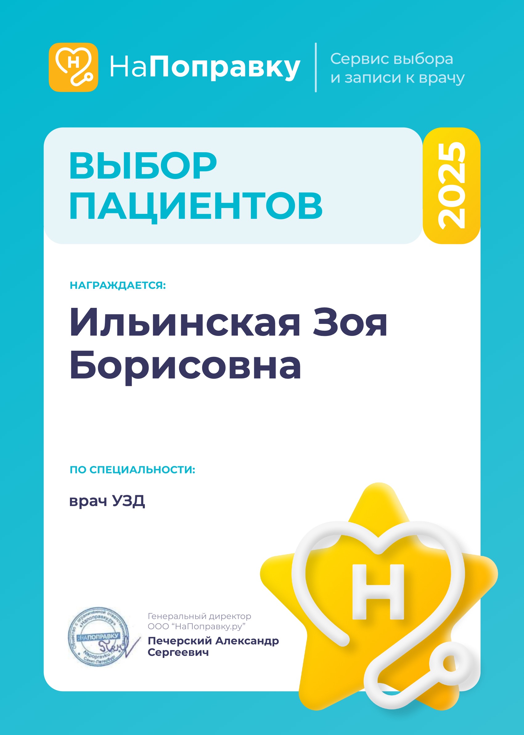 Уже несколько лет я регулярно обращаюсь к Зое Борисовне Ильинской для проведения ультразвуковых исследований и каждый раз убеждаюсь в её высоком профессионализме. Результаты её обследований не только...