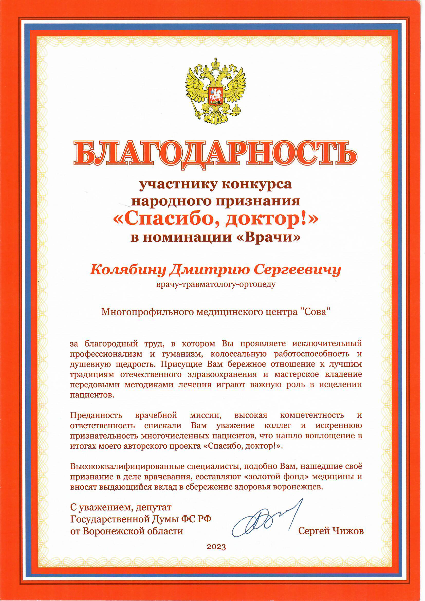 Всероссийская премия ПроДокторов 2023: 1 место в категории "Травматолог" по Воронежской области.