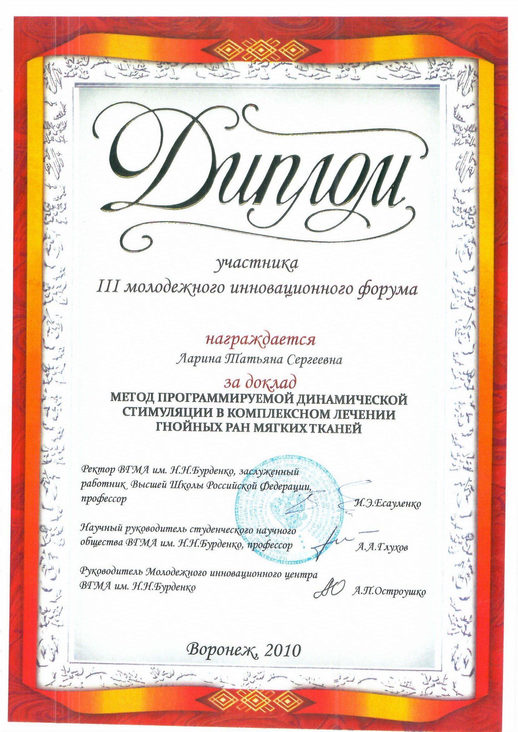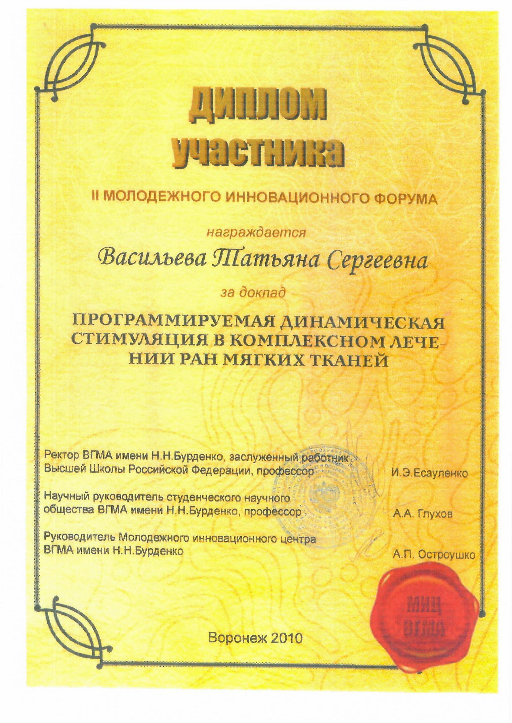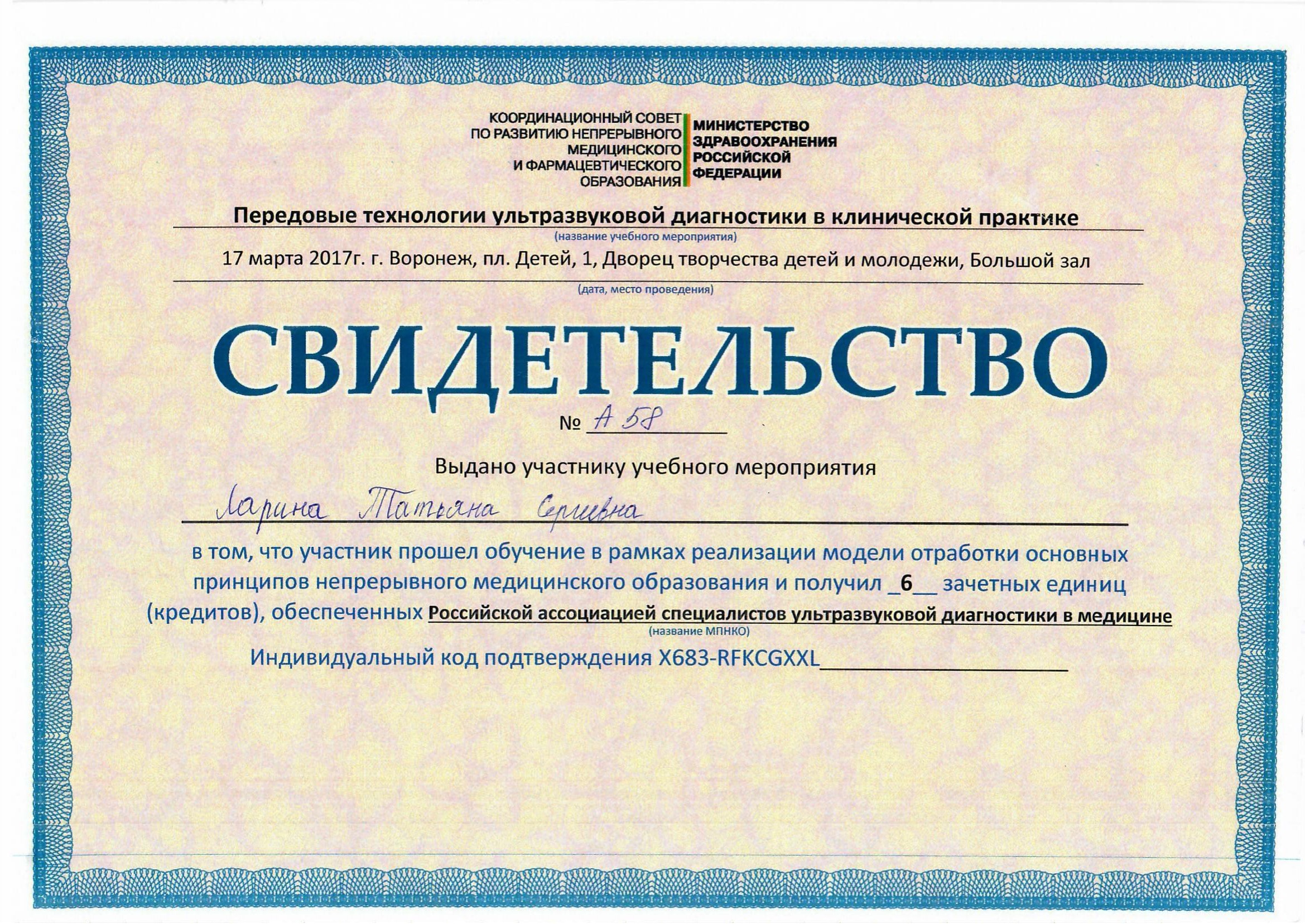 • Диплом о профессиональной переподготовке № 313600017460 от 21.12.2016 по специальности «Ультразвуковая диагностика», выдан ИДПО ГБОУ ВПО ВГМУ им. Н.Н. Бурденко Минздрава России;