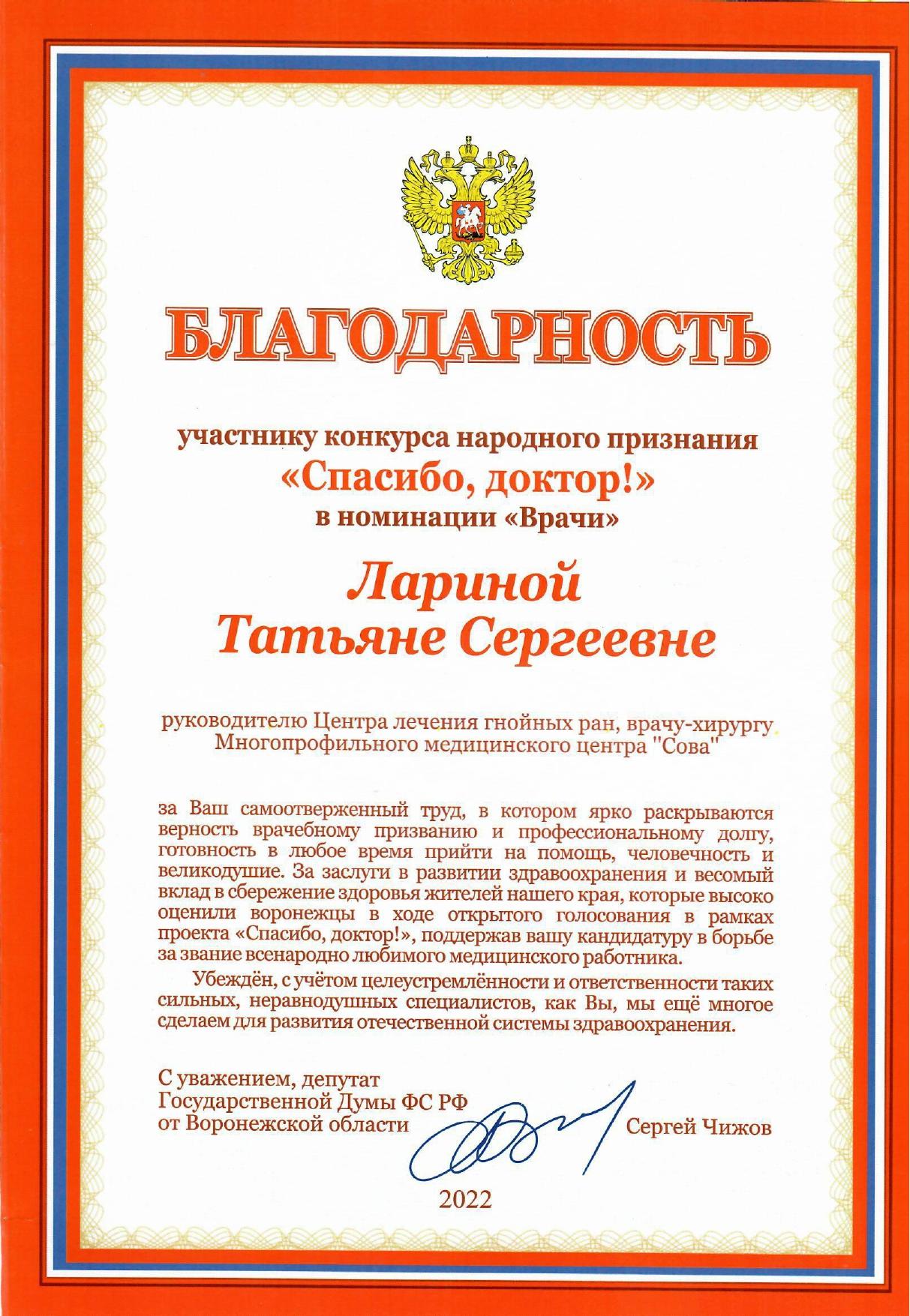 Выражаю огромную Благодарность Лариной Татьяне Сергеевне! Хирург высочайшего класса. Талант! Татьяна Сергеевна Ларина, осуществила мне операцию по удалению опухолевидного новообразования. Грамотные...