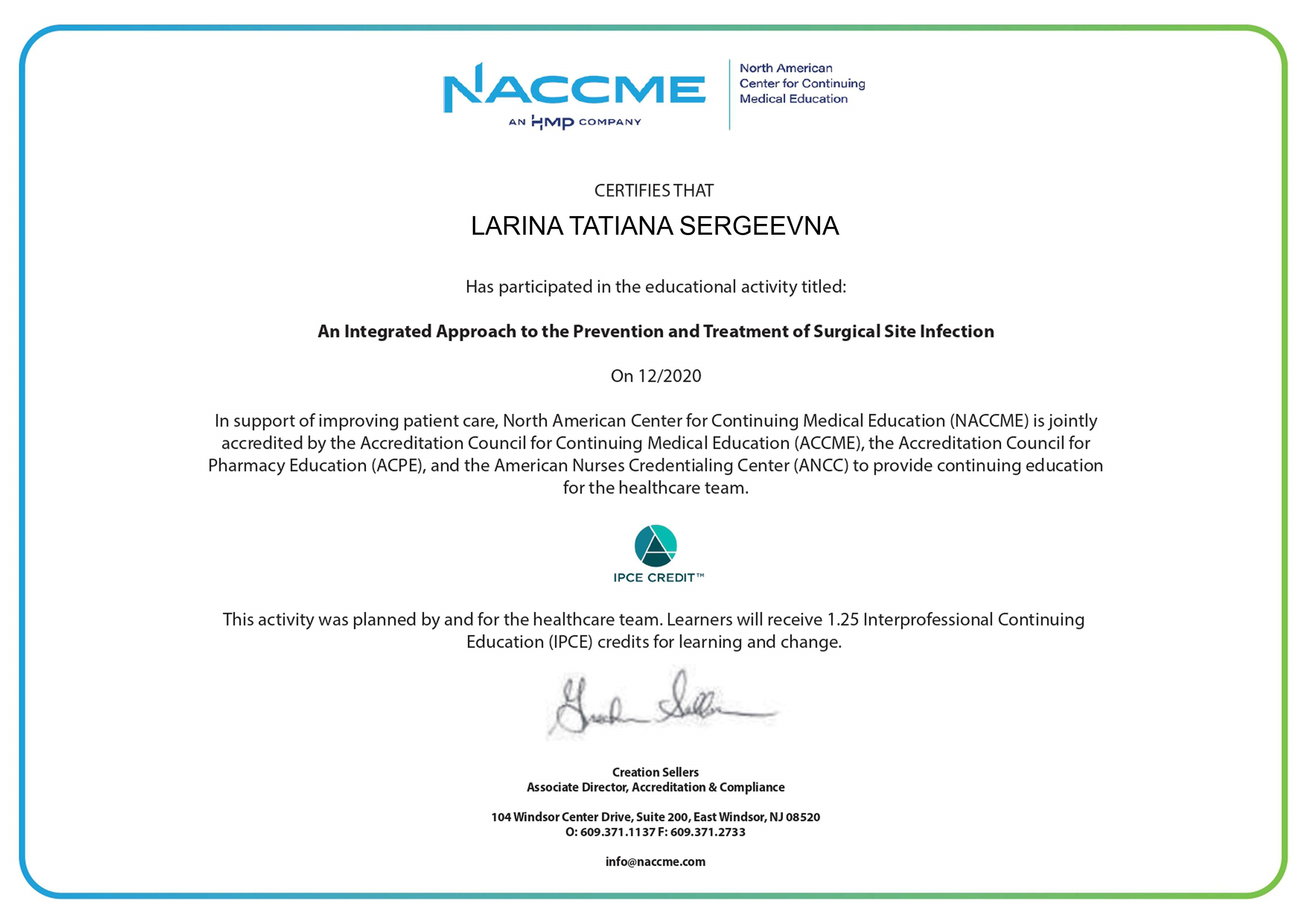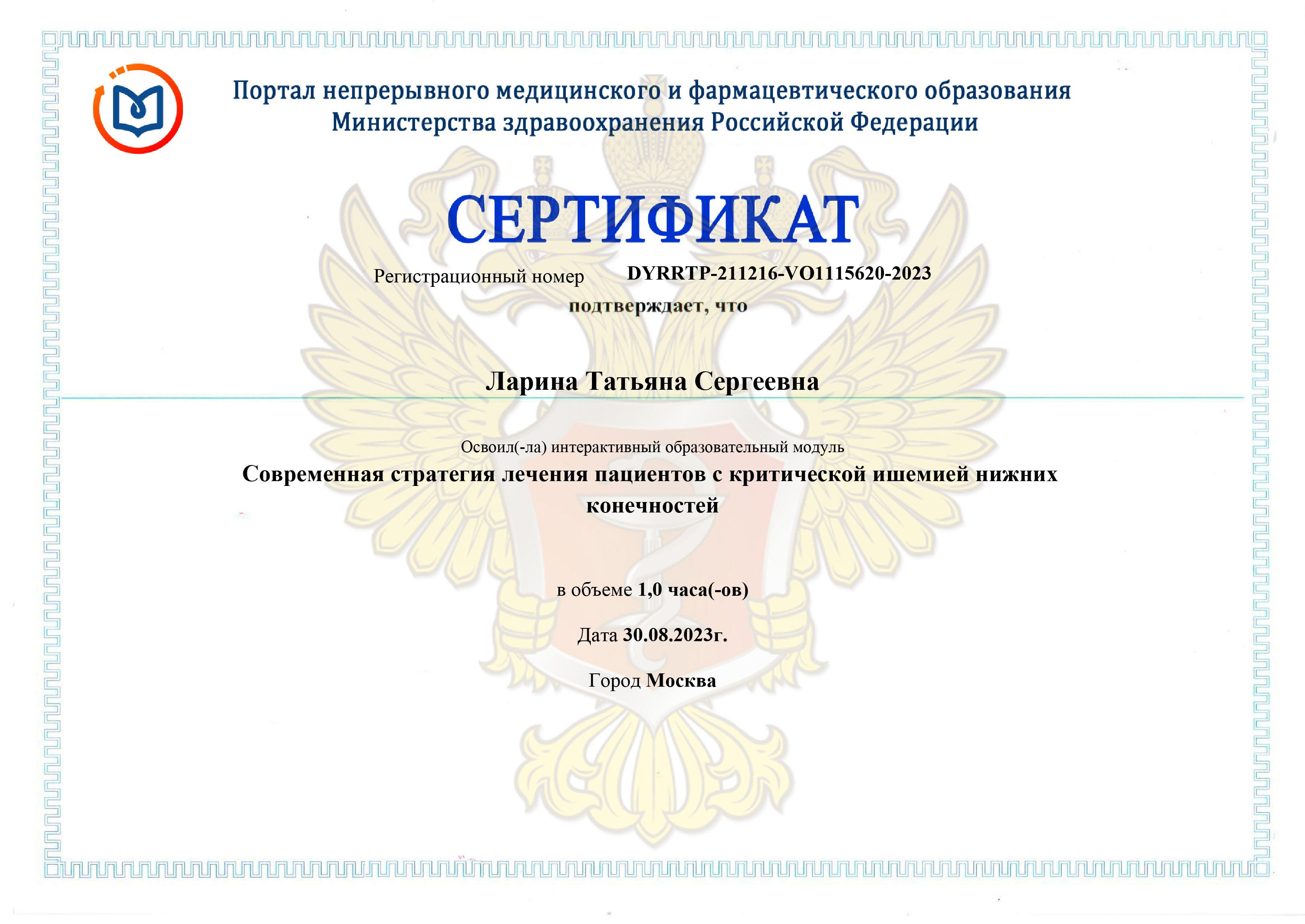 • «Современная стратегия лечения пациентов с критической ишемией нижних конечностей», выдано НМО 30.08.2023, г. Москва