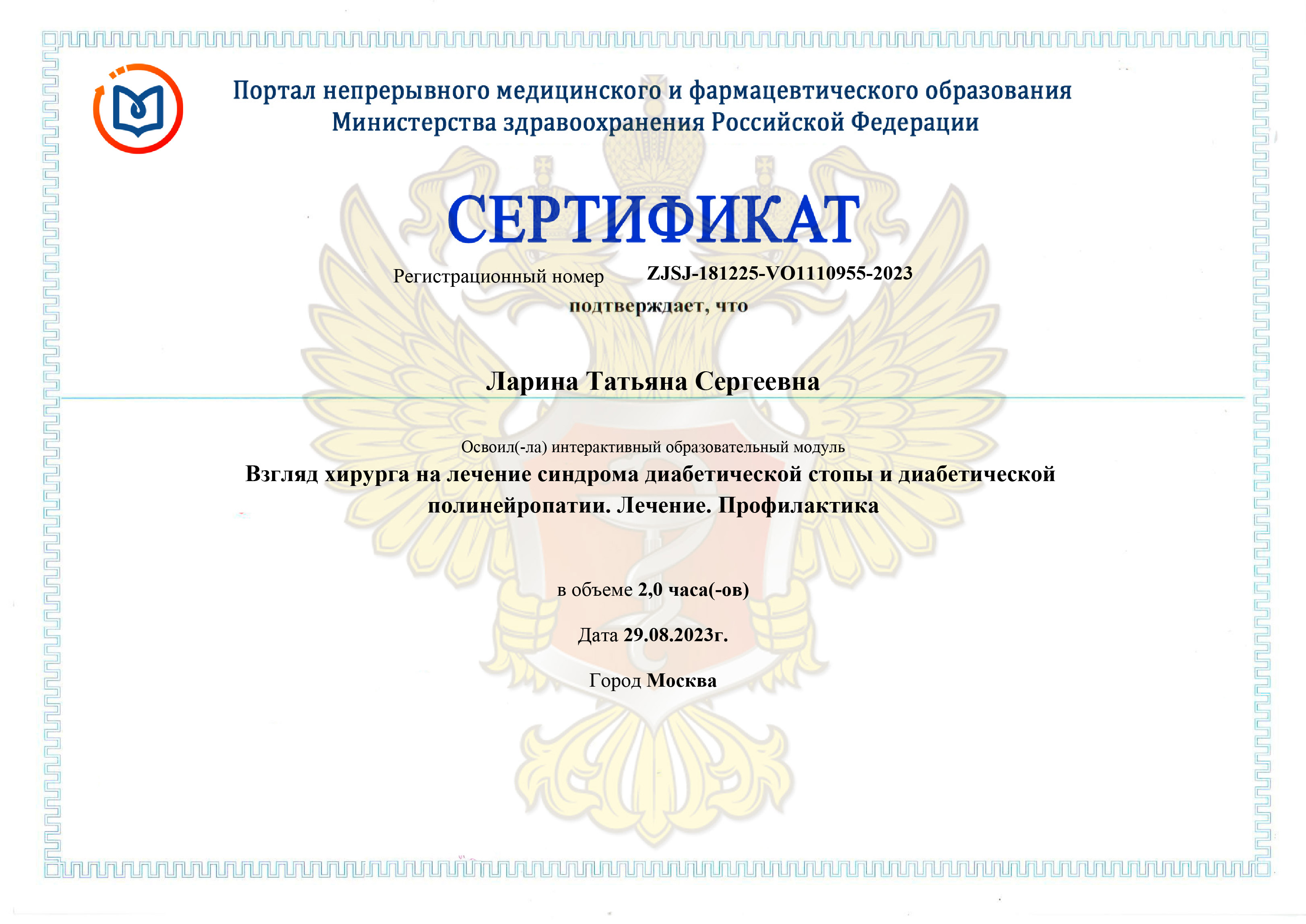 • «Взгляд хирурга на лечение синдрома диабетической стопы и диабетической полинейропатии. Лечение. Профилактика», выдано НМО 29.08.23, г. Москва