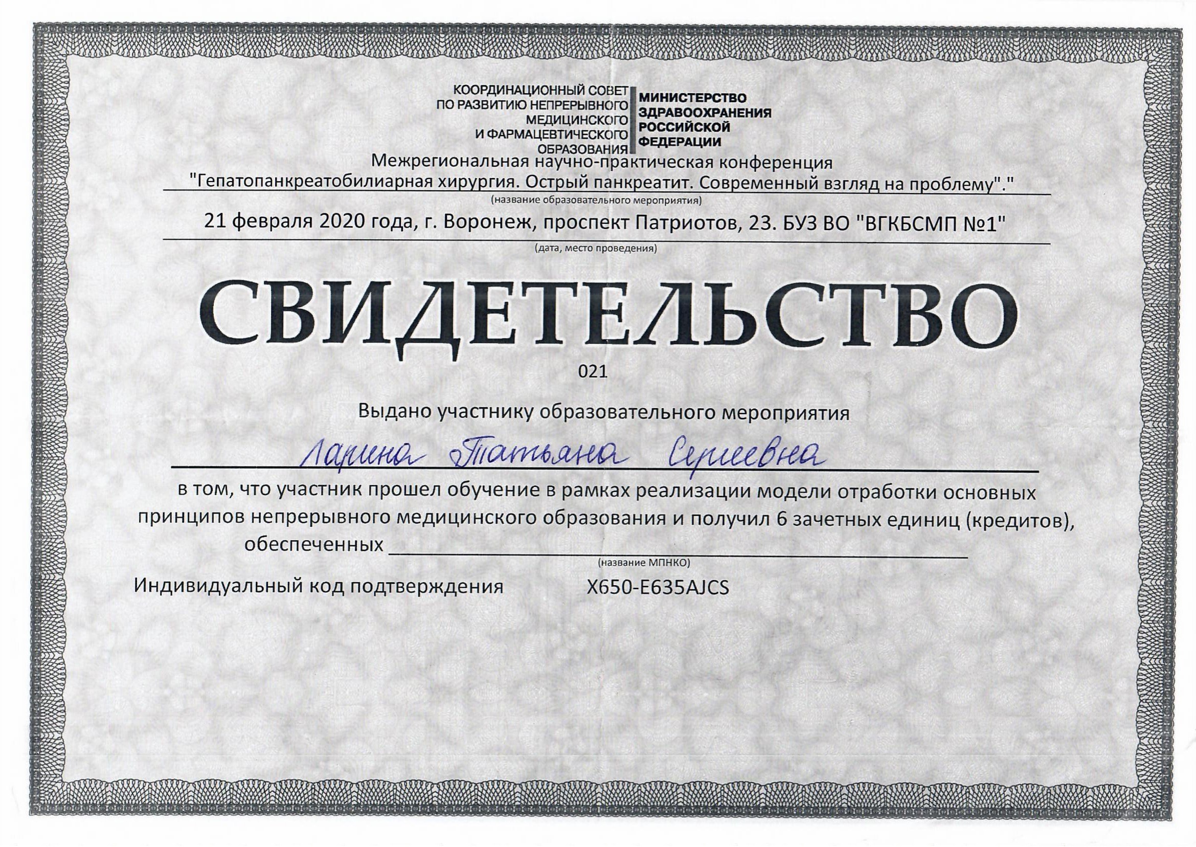 • Удостоверение о повышении квалификации № 7800 00021002 от 04.03.2020 по программе «Профпатология», выдано АНО ДПО "Центр последипломного образования медицинских работников.