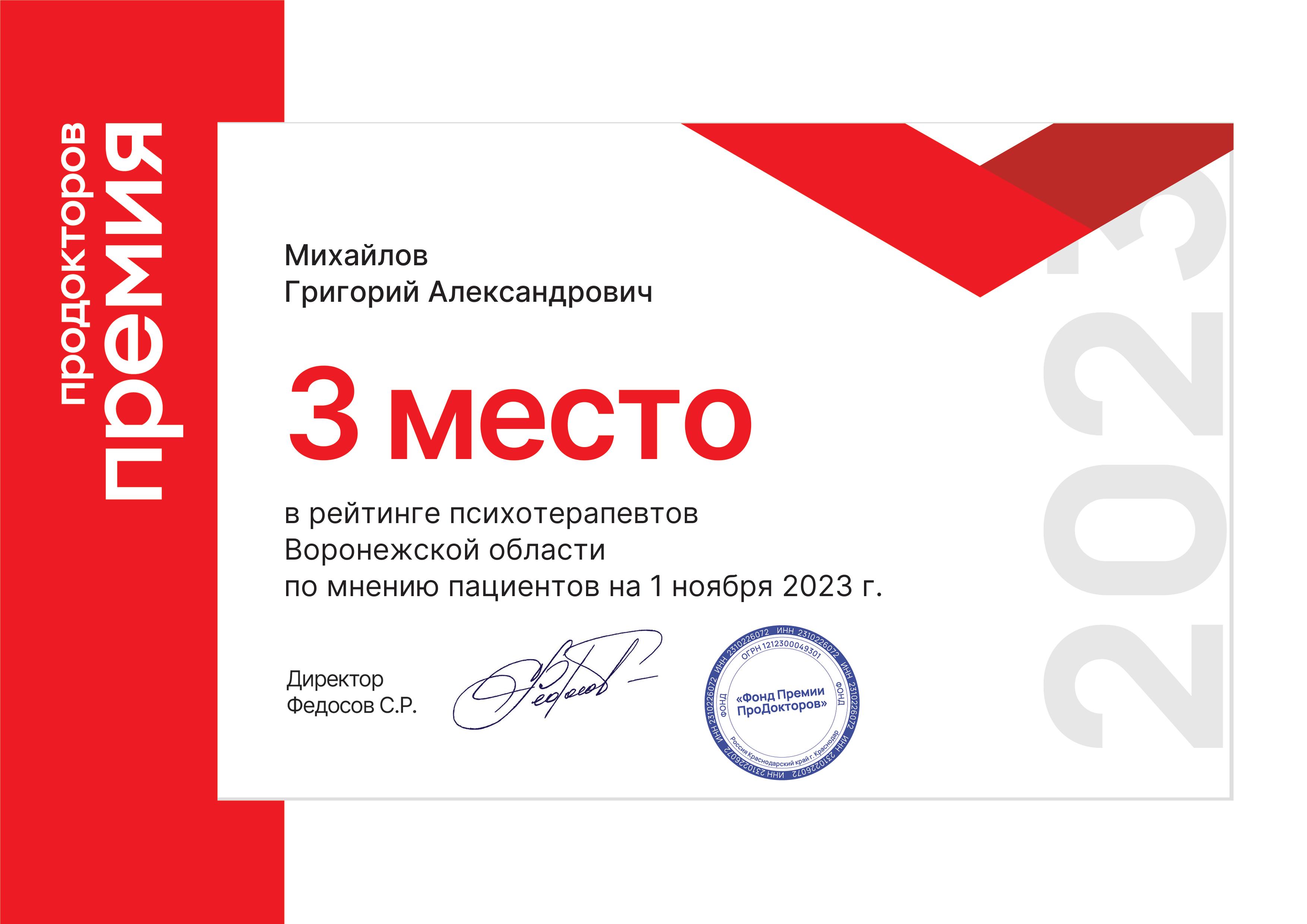 Всероссийская премия ПроДокторов 2023: 3 место в категории "Психотерапевты" по Воронежской области.